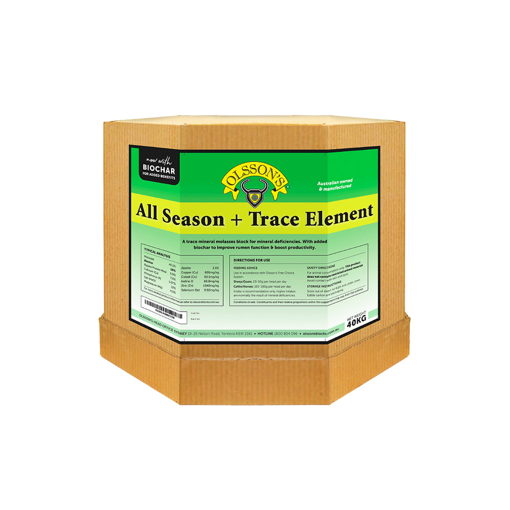 Olsson’s All Season Plus Trace Element is a supplement designed for all pasture conditions and can be fed to all livestock. All Season Plus Trace Element contains high levels of minerals including copper, cobalt, iodine, zinc, and selenium. It also contains biochar for improved rumen function & boosted productivity. With a high molasses content this block is palatable, even on coastal areas. Ensure Olsson’s High Sulphur 12% block is available to limit intake and promote a balanced supplementation program.