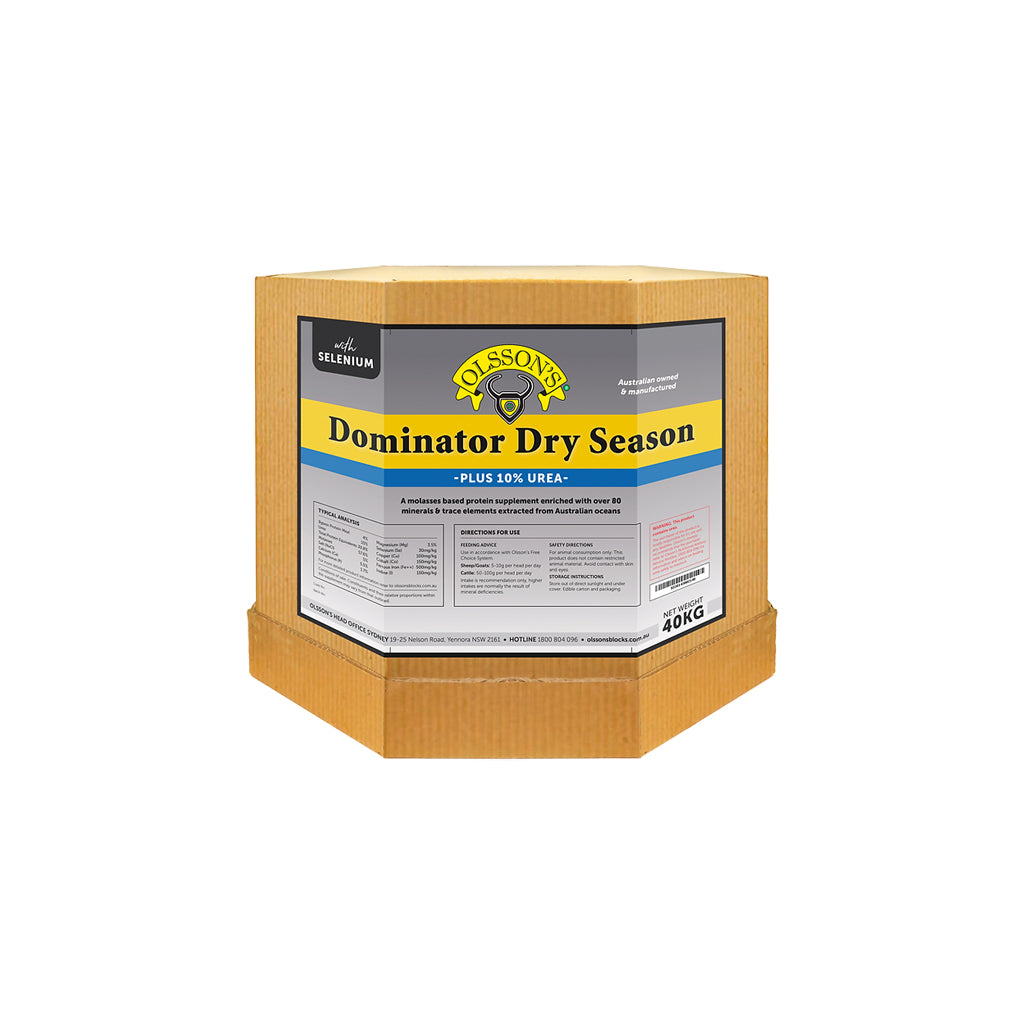Olsson’s Dominator Dry Season plus 10% Urea blocks are an easy, cost-effective method of delivering a balance of minerals and trace elements to the rumen as well as supplementing rumen protein in the form of urea. Dominator is effective in promoting and maintaining weight gain. Dry Season contains nitrogen (urea) and micro & macro minerals some of the major elements required for rumen function. When these elements are balanced it results in an efficient breakdown of dry and fibrous feeds, such as stubble and dry pastures.