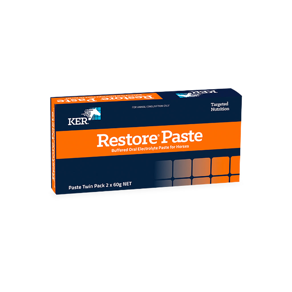 A carefully formulated electrolyte paste to match the composition of sweat. RESTORE PASTE is an easy-to-administer product that includes a buffering agent designed to support gastrointestinal comfort in horses. When horses sweat they lose electrolytes, with the principal losses being chloride, sodium, potassium, and magnesium. If these essential nutrients are not replenished, the consequences may include dehydration, muscular weakness, overheating, fatigue and poor performance. The composition of RESTORE PASTE mimics horse sweat so it effectively replaces what has been lost in sweat.